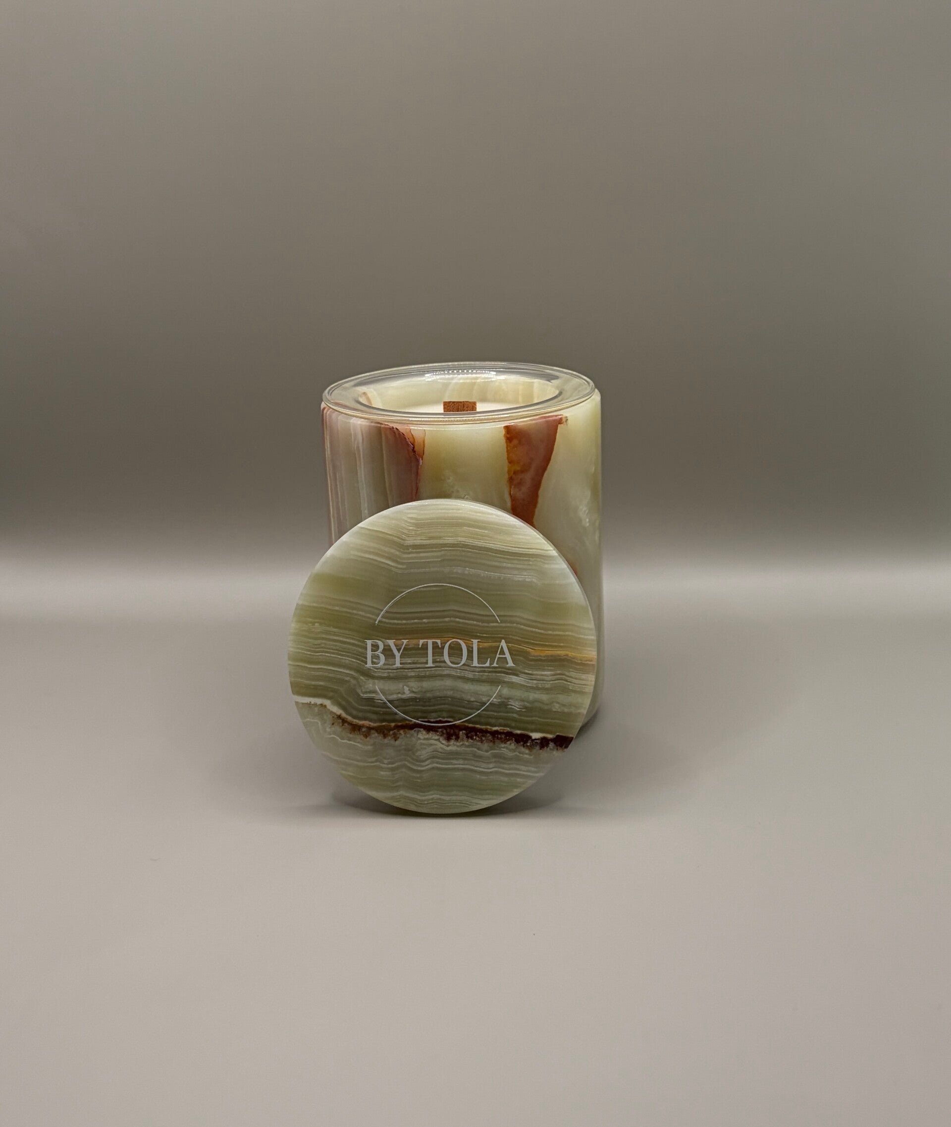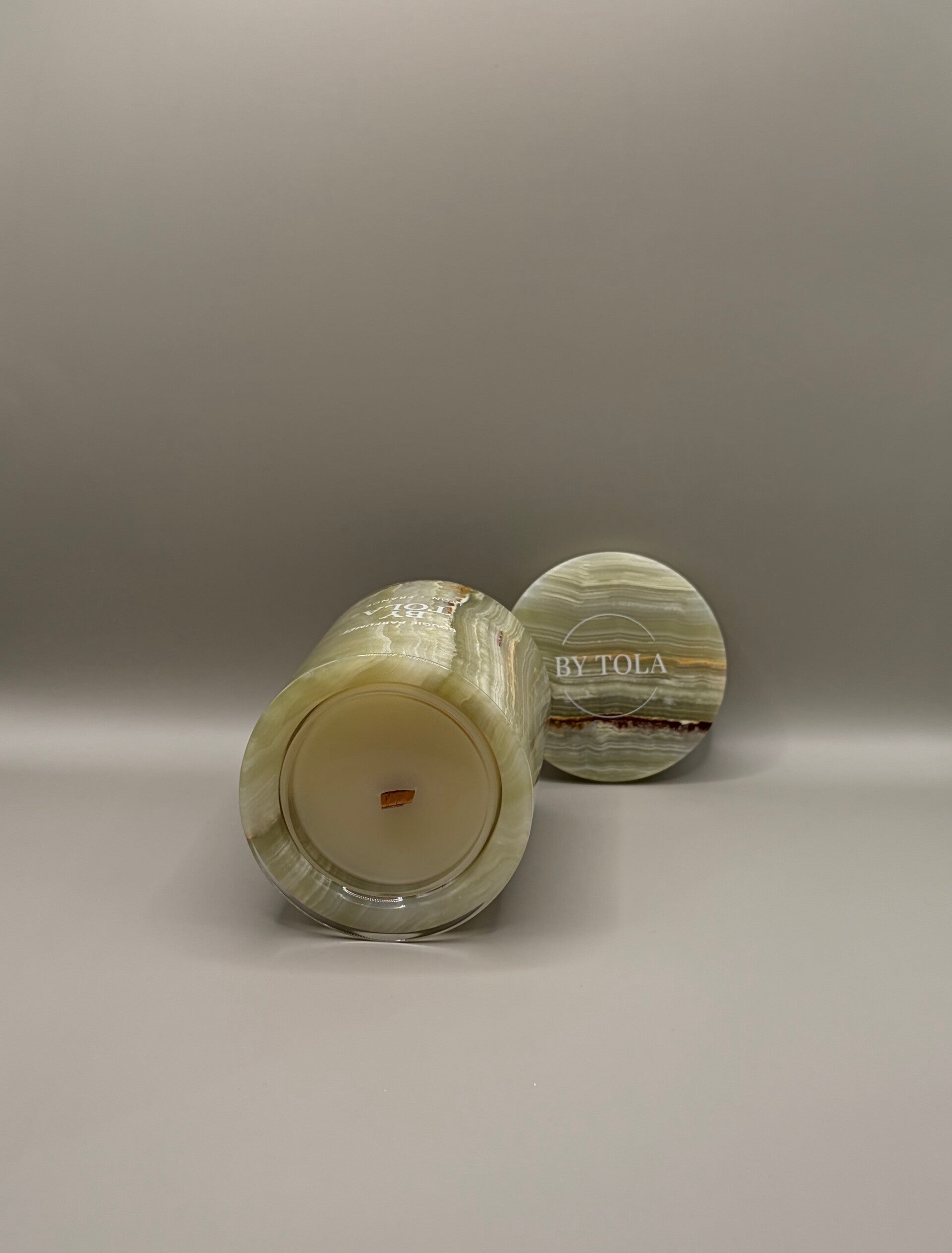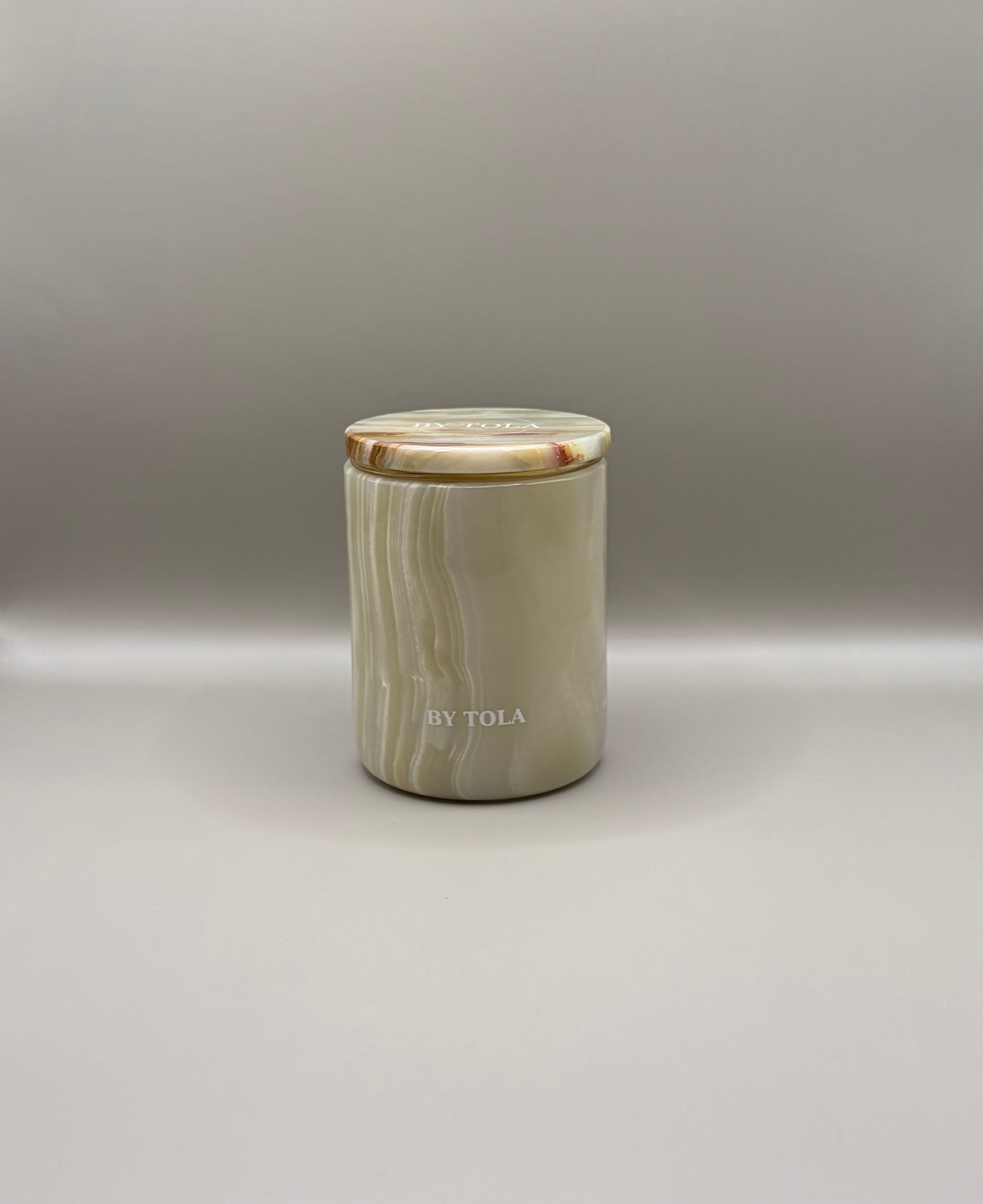 Pot : Marbre onyx vert clair aux veines dorées, taille et poli en atelier spécialisé.